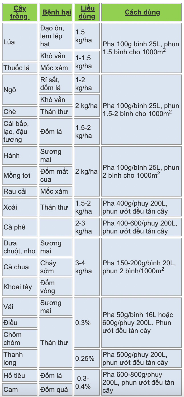 - Đặc trị phổ rộng nhiều loại bệnh hại trên lúa, rau, cây ăn trái, cây công nghiệp.