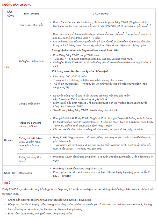 Trên Ca cao: Eddy 72WP đặc biệt phòng trừ hiệu quả các bệnh hại quan trọng trên ca cao như: khô trái non, thối trái, xì mủ - loét thân, thối gốc - cổ rễ, vàng - rụng lá, nhất là trong điều kiện mùa mưa, ẩm độ cao.