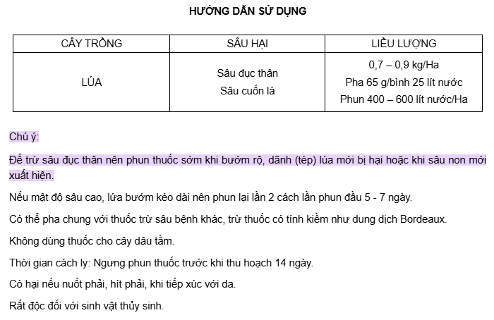 Có phổ tác dụng rộng, đặc biệt hiệu quả trừ sâu đục thân, sâu cuốn lá hại lúa ...