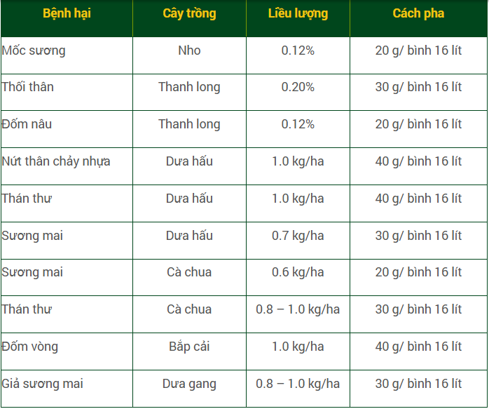 Đặc trị các loại bệnh như: Đốm nâu, đốm vòng, phấn trắng, mốc sương, thán thư, nứt thân chảy nhựa, sương mai, thối thân, giả sương mai