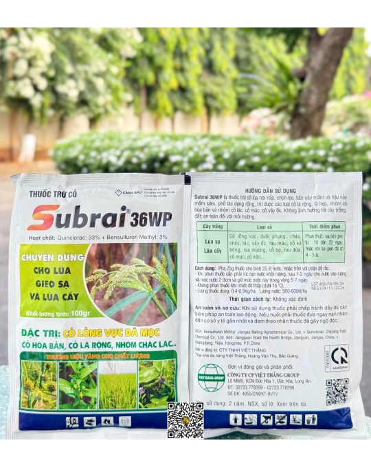 SUBRAI 36WP là thuốc trừ cỏ lúa nội hấp, chọn lọc, tiền nảy mầm và hậu nảy mầm sớm, phổ tác dụng rộng, trừ cỏ lồng vực đã mọc( từ 1 đến 3 lá mầm) và các loại cỏ lá rộng, lá hẹp, nhóm cỏ hòa bản và nhóm cỏ khác. Không ảnh hưởng tới cây trồng, đất; an toàn đối với môi trường.