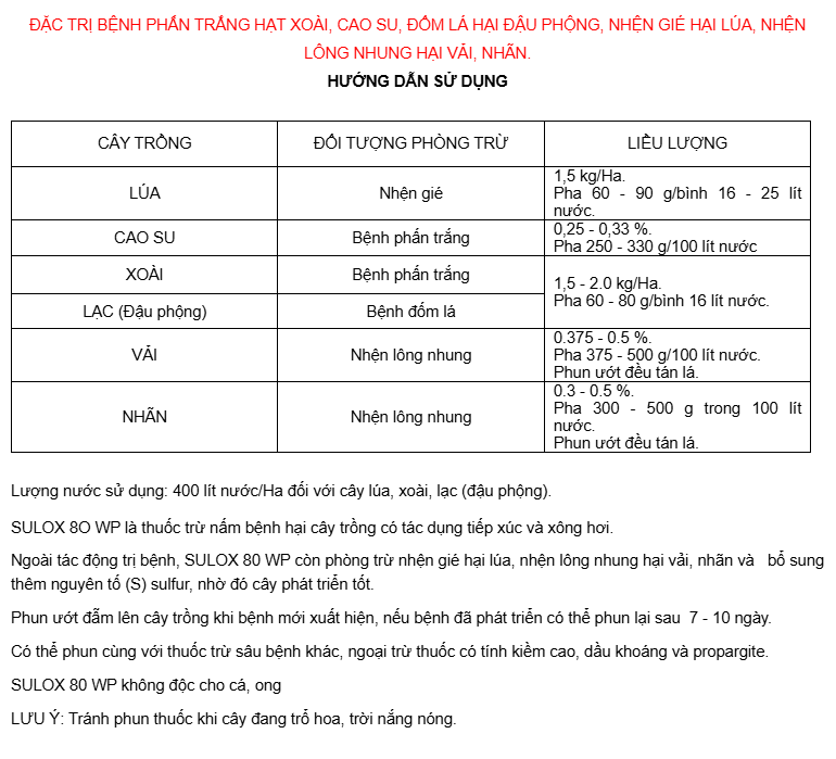 SULOX 8O WP là thuốc trừ nấm bệnh hại cây trồng có tác dụng tiếp xúc và xông hơi.