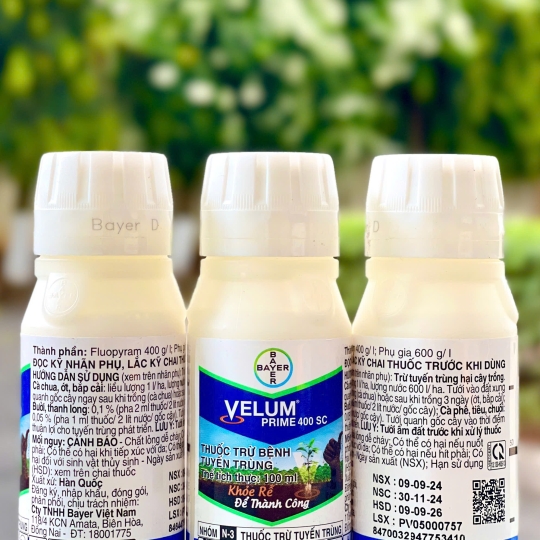 Velum Prime 400SC một giải pháp nông học dạng huyền phù. Có khả năng kiểm soát tuyến trùng trên cây cà phê, hồ tiêu và bắp cải. Velum cũng là thuốc trị tuyến trùng đầu tiên có khả năng ức chế chọn lọc thế hệ tế bào tạo năng lượng của tuyến trùng. Giải pháp này giúp nhà nông phòng trừ tuyến trùng hiệu quả, duy trì sức sống và tối đa hóa tiềm năng năng suất cây trồng.
