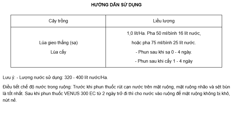 VENUS 300EC diệt trừ nhiều loại cỏ trong ruộng lúa như: Cỏ đuôi phụng, lồng vực, chác, lác, mác bao, xà bông và lúa cỏ (lúa rài, lúa lộn),... trên lúa gieo thẳng (sạ) hoặc lúa cấy.