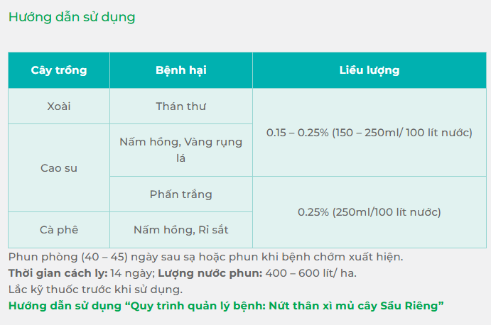 CAMILO 150SC – Thuốc trừ nấm bệnh phổ rộng chuyên trừ bệnh thán thư trên xoài, vàng lá rụng lá, nấm hồng, phấn trắng, rỉ sắt trên cao su, cà phê… Làm khô nhanh vết bệnh chỉ sau 01 ngày phun thuốc. Nấm bệnh rất khó hình thành tính kháng nhờ có cơ chế tác động kép.