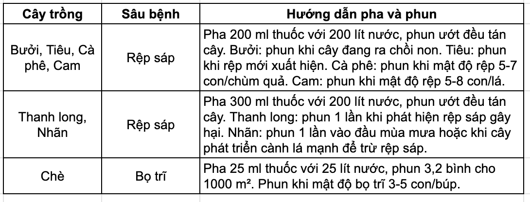 - Thuốc không gây hại kiến vàng nên rất phù hợp cho quản lý dịch hại (IPM) trên cây bưởi (cây có múi)