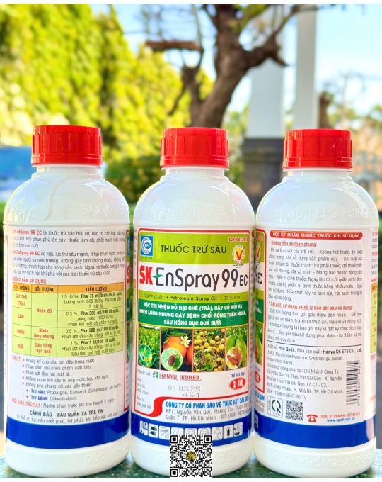 • Dầu khoáng SK Enspray 99EC là thuốc phổ rộng, hiệu quả cao trừ nhện, rệp sáp, các loại rầy, sâu vẽ bùa, ruồi trắng, rầy chổng cánh trên cây ăn trái, cây công nghiệp, rau, cây cảnh, cây trồng trong nhà lưới.